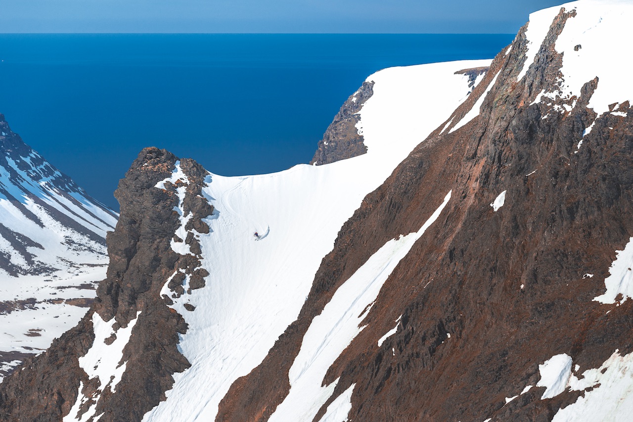 Less than one degree south of the Arctic Circle, Hornstrandir juts out from Iceland into the Strait of Denmark. North Atlantic winds sweep across the high peninsula while the fjords, fingers of ocean reaching inland, remain sheltered. Along the walls of the fjords, tiers of jet-black basalt cliffs cut by deep snow-filled couloirs alternate with smooth, open bowls that descend in one sustained drop from the broad upper plateau to turquoise lagoons far below. Down at the rocky shoreline, the occasional call of a black and white Guillemot, gliding above the water, beckons us to explore this stark landscape with our skis.
