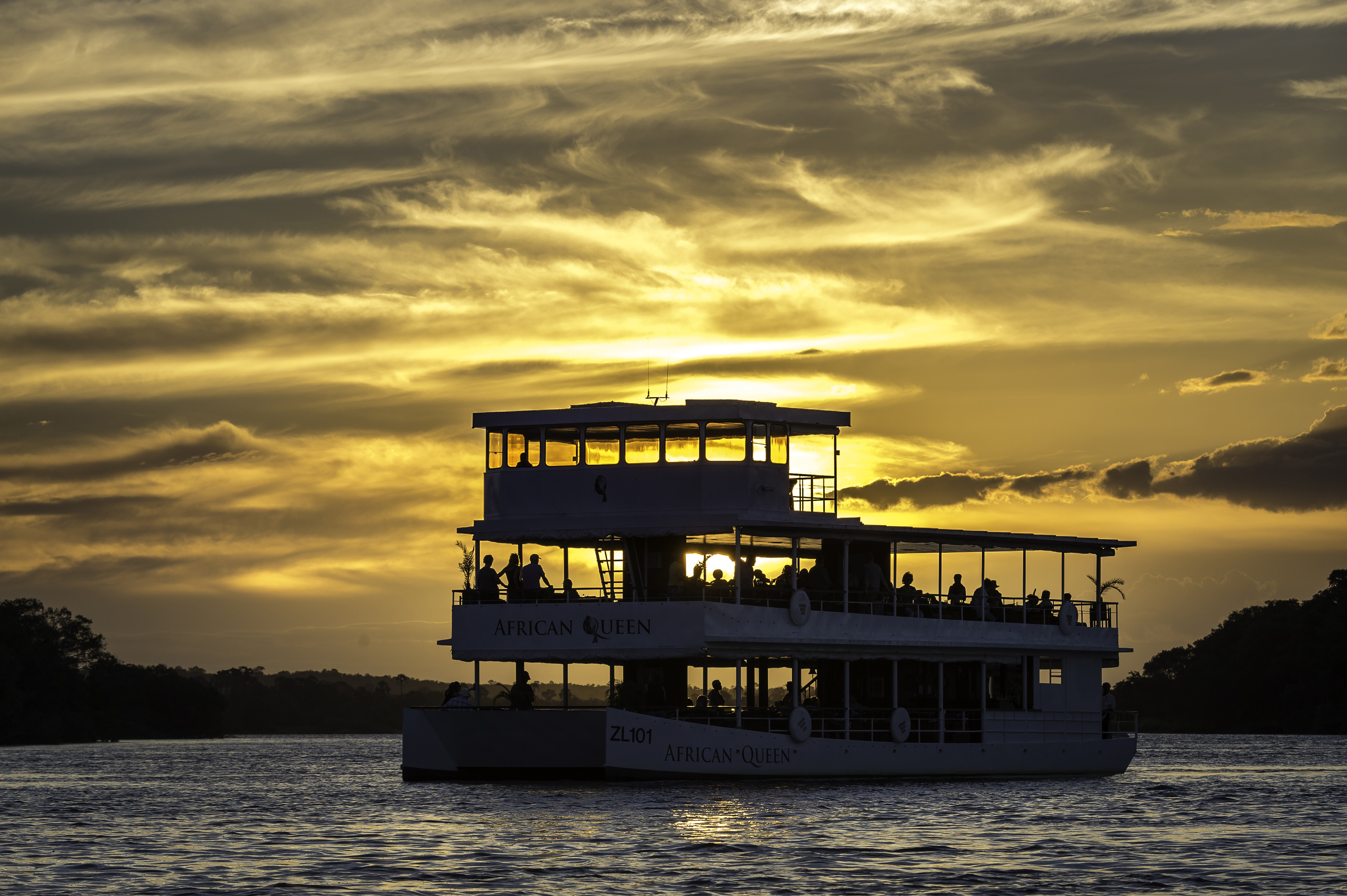 A visit to Livingstone would not be complete without a river cruise, preferably at sunset, on The African Queen is a highly recommend choice. You travel at a stately speed up the Zambezi River above the falls, catching glimpses of hippos and crocs, and plied with gin & tonics and tasty snacks that are brought regularly by your ever attentive waitress.