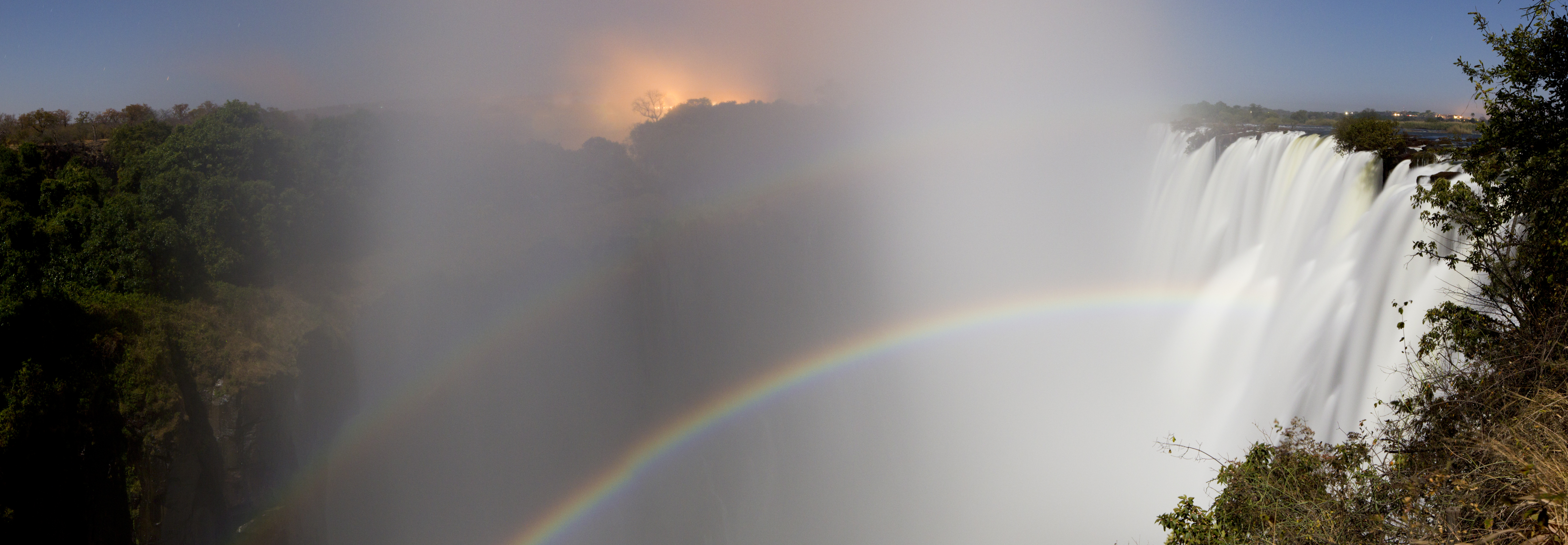 The Victoria Falls is the result of thousands of years of erosion. The Zambezi River, flowing across a basalt plateau, in ancient times found cracks in the basalt that were filled with sandstone, and started wearing away the softer rock, eventually creating a series of magnificent and dramatic gorges. In fact the falls have been gradually receding for over 100,000 years! This process of erosion has been repeated over and over again, and the zigzagging gorges downstream of the current falls represent the formation and abandonment of seven previous waterfalls. Today the river crashes over a wide cliff, plunging down 108 metres into a powerful whirlpool, forming the greatest curtain of falling water on the planet, and transforming the placid river into a ferocious torrent. In the height of the rainy season more than five hundred million cubic metres of water a minute surge over the edge of the almost 2km wide falls and plummet into the gorge below… columns of spray can be seen from miles away, hence its Zambian local name, Mosi-oa-Tunya, "the smoke that thunders".