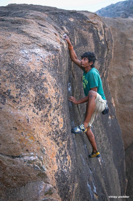 After nearly thirty unsuccessful attempts on Ayurveda (7c+), a crimp-to-crimp power sucker at Hampi, Sandeep seemed spent. He put on his shoes for a token ‘last try’, took an impatient breath and went for the take off. He grimaced through every move and finally stuck the last dyno with a violent right leg swing propelling him. When it was done, even he couldn’t figure out where that extra juice had come from. But Sandeep is no stranger to running on empty.