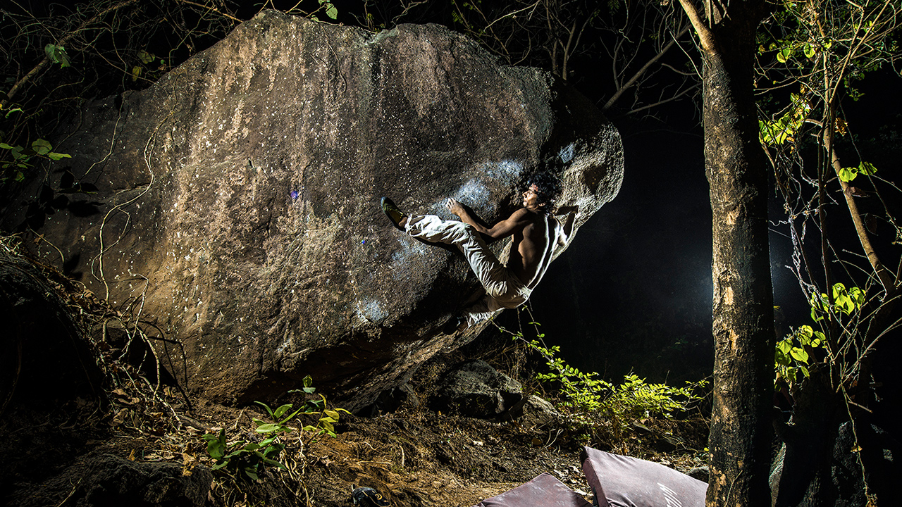 Ajij Shaikh, a stick-thin, withdrawn young man was alone nearby, composing himself. He’d come excruciatingly close to completing it, but had repeatedly failed at the crux. He stood up to return to the problem. Taking off his shirt, he revealed shred upon shred of lean brown muscle. Ajij pulled on a pair of borrowed climbing shoes, took a few breaths and sat down to try again. I stood behind, ready to spot him should he fall.