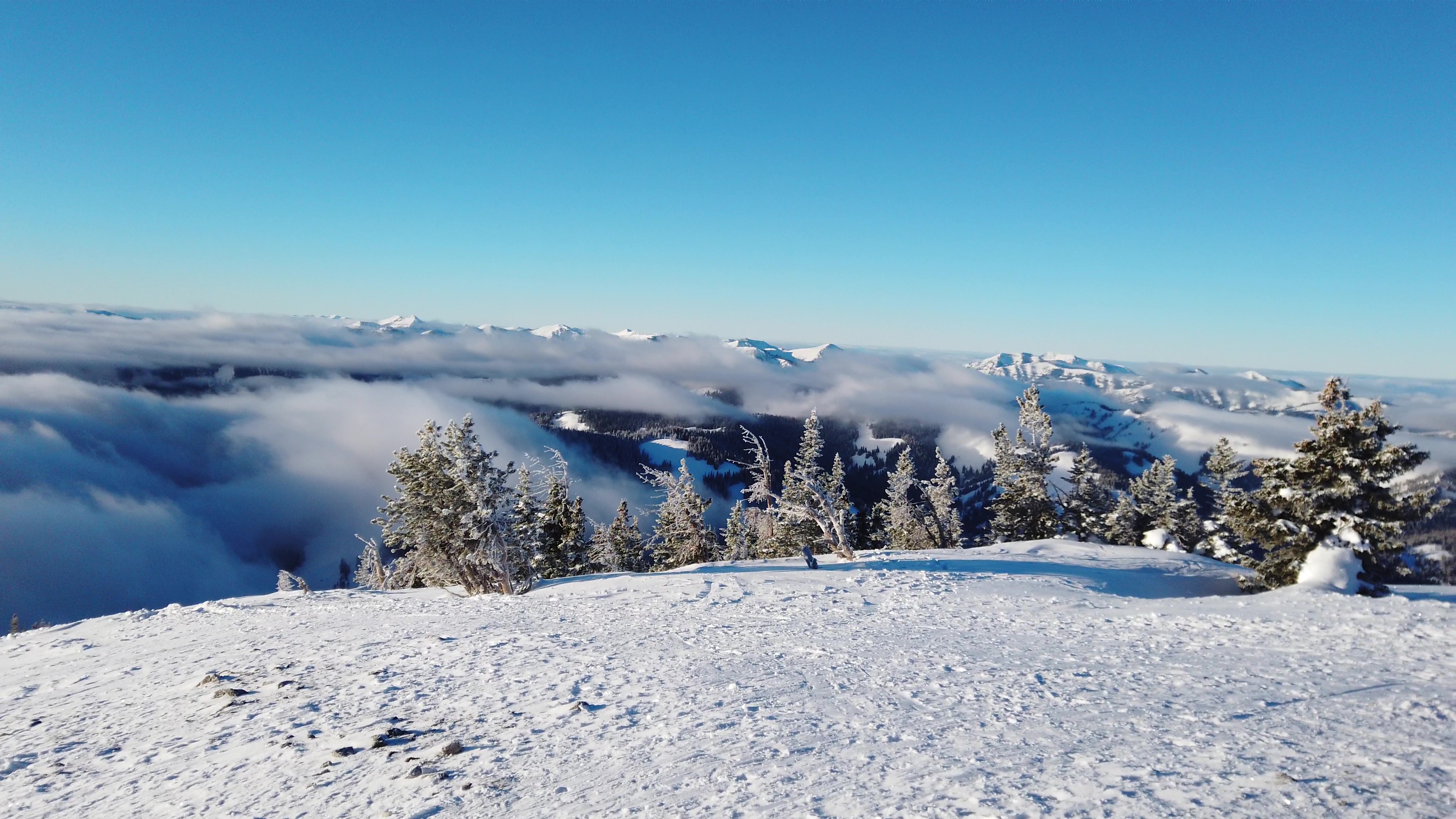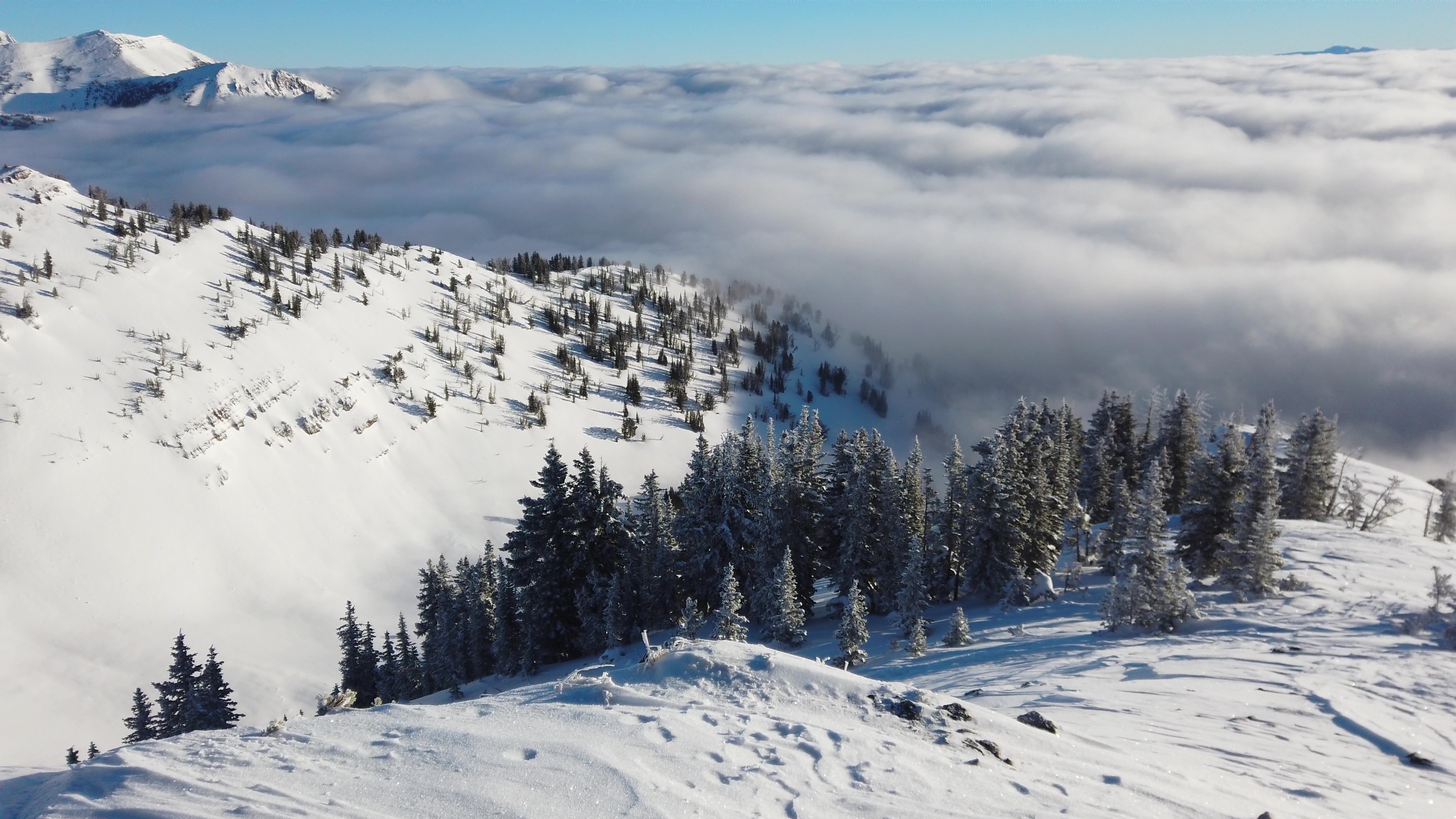 Even the evergreens projected patriarchy: the tallest trees nucleated their sapling broods with paternal solemnity, each molecule of powder glistening in the shaggy green branches. We broke through the forest onto snow-covered Amphitheater Lake, a cirque bounded by the bald, mangled granite of Teewinot to the north and Disappointment Peak to the west. On a snack pitstop, we watched another party of skiers lay down tracks in Spoon Couloir, a steep, enticing chute on Disappointment Peak’s lower haunch. Brendan seemed to sense my desire to get after a big alpine line and suggested we bootpack the Spoon— must have been his newly acquired parental mind-reading superpower. After crossing the lake, we cut a haphazard zig-zag to the top of the Spoon’s apron and transitioned to the bootpack. 500 feet of vertical boot-punching propelled us up the gut and bookended the nearly 5,000 feet of vertical notched from trailhead to objective. From our humble perch on Disappointment’s flank, an electric blue sky slumbered atop a soupy mass of clouds, hallmark of a Teton Valley temperature inversion. Backgrounded by this topsy-turvy atmosphere, I skied down the hard-packed snow of the spoon’s handle into its apron of softer powder.