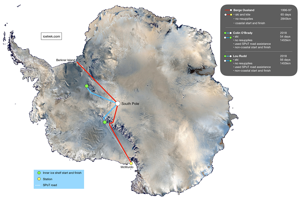 It’s difficult to come to an objective conclusion as to whether the South Pole Overland Traverse, which runs from the Leverett Glacier down to the McMurdo base, disqualifies O’Brady’s “unsupported” claim. Using decades-old aerial photos for navigation, Ousland and Horn were probing unknown landscapes with the real danger of falling into crevasses. In contrast, SPOT significantly reduces the dangers of falling into a crevasse, and its markings make navigation easier; however, it’s unclear whether the track equates to the same level of assistance as wind power or motorized support given the first-hand accounts by O’Brady and Rudd of their difficult goings.