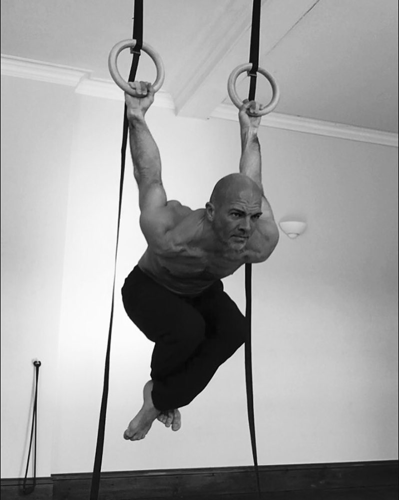 Nick demonstrates full shoulder dexterity on the gymnast rings.