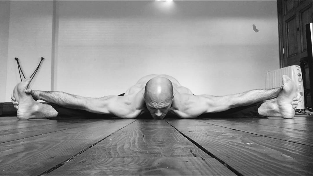 Nick demonstrates a full straddle split.