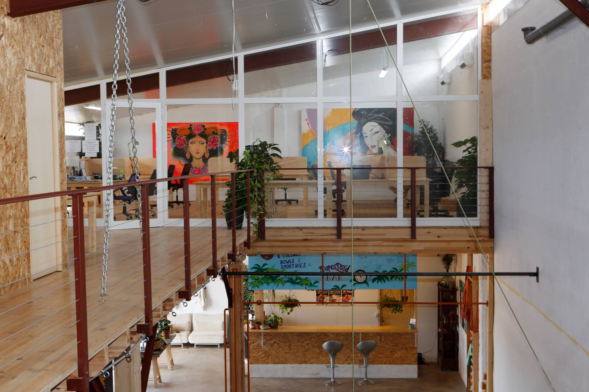 Co-working spaces overlook the gym and smoothie bar at Project Ibiza.