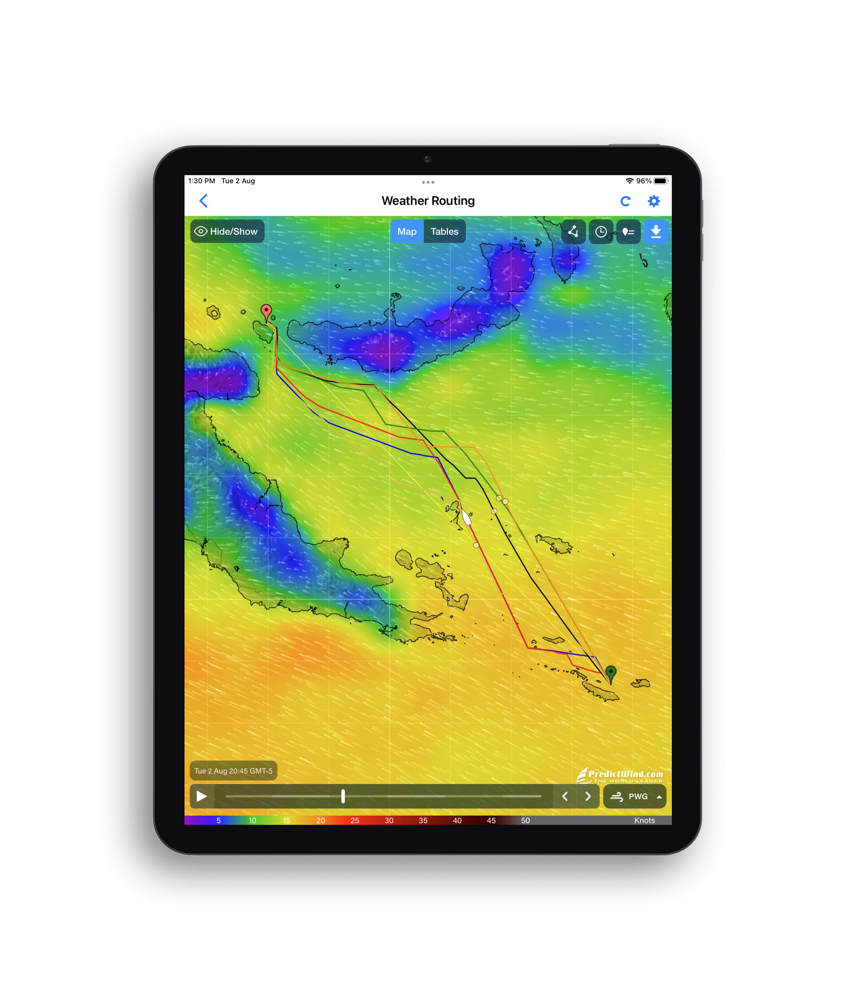 Bilger gave an example of how he used PredictWind in a recent trip from Auckland to Fiji, along with one of PredictWind’s skippers. “Using our tool is just like Google Maps,” he said. “You put in your start, your destination, you put in the performance curve of the boat so it knows what it's going to do in different conditions. Then, boom, it gives the fastest route, and it gives you the weather along that route [based on] the six models, the wind, the wave conditions, the current. You also can do a departure plan, so it gives you the info for Day One, Day Two, Day Three, and so on.”