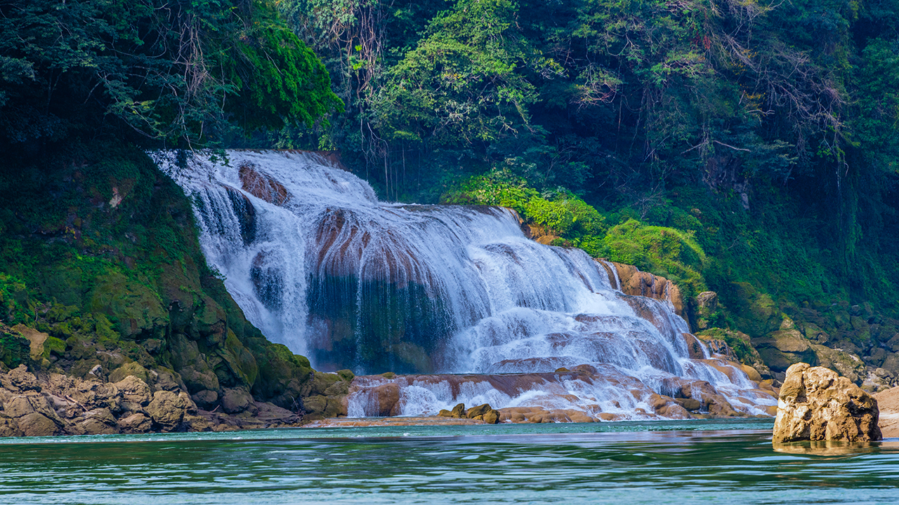 A couple of hours below Piedras Negras we pulled into a cove with a most spectacular waterfall, Cascadia Busiljá. Coming down a steep canyon, its source stream plunges over travertine-coated rocks and projects into the river. Most of us hiked up a trail behind the falls to see its origin. Others cooled off below in the spray shower that envelops the outcropping.