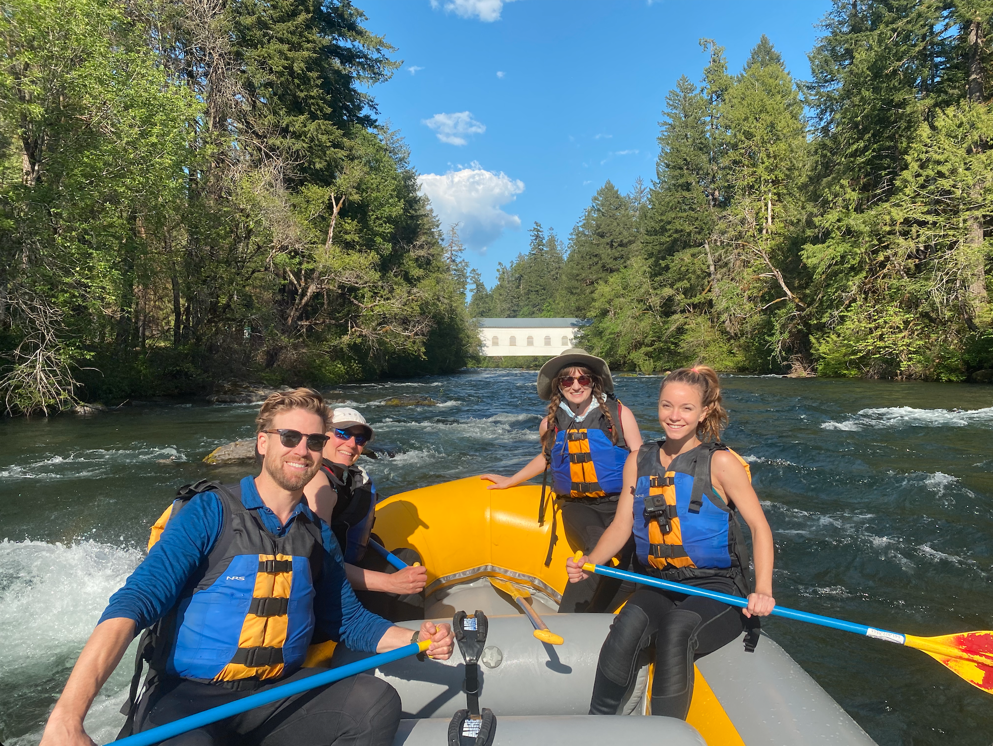 Our reward for a difficult day’s work is a river rafting trip down the McKenzie River. Alex, our mountain biking guide, will take us down the river. He tells us he is able to get us down the river himself, so any paddling we want to do was optional. Perfect. Especially perfect because we are not all that experienced of a group, as Alex can tell by some of our questions like “Should I put my clothes on under or over my wetsuit?” and “Will my Tevas work for booties?” We sat back and relaxed as we wound down the river, hearing the history of the cabins along it. When we reached our first set of rapids, Alex told me to “ride the bull,” which of course I could not refuse. This means sitting on the front of the raft, your feet dipping towards the river, and hold on tight!