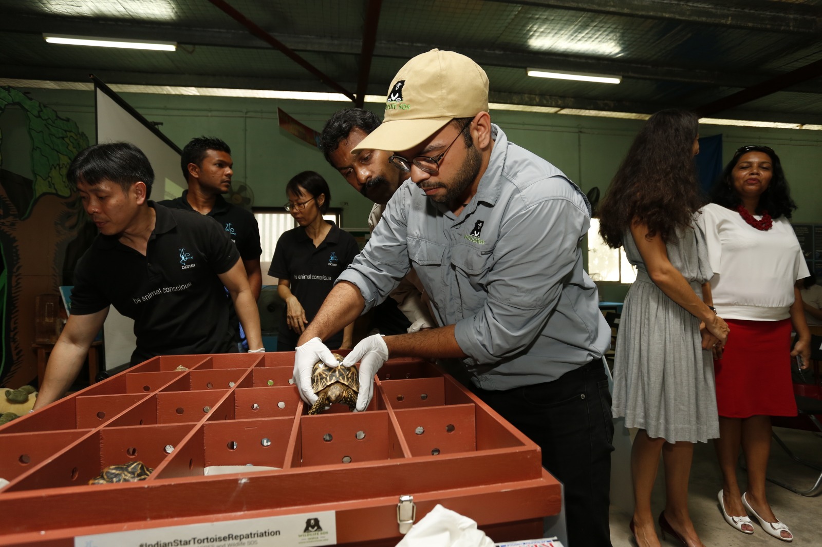 The 50 Indian Star Tortoises tortoises had been smuggled into Singapore illegally where they were confiscated by Singapore authorities. With cooperation from the Indian & Singapore Governments, they will now be repatriated to India and returned to their natural habitat in the forests of Karnataka.