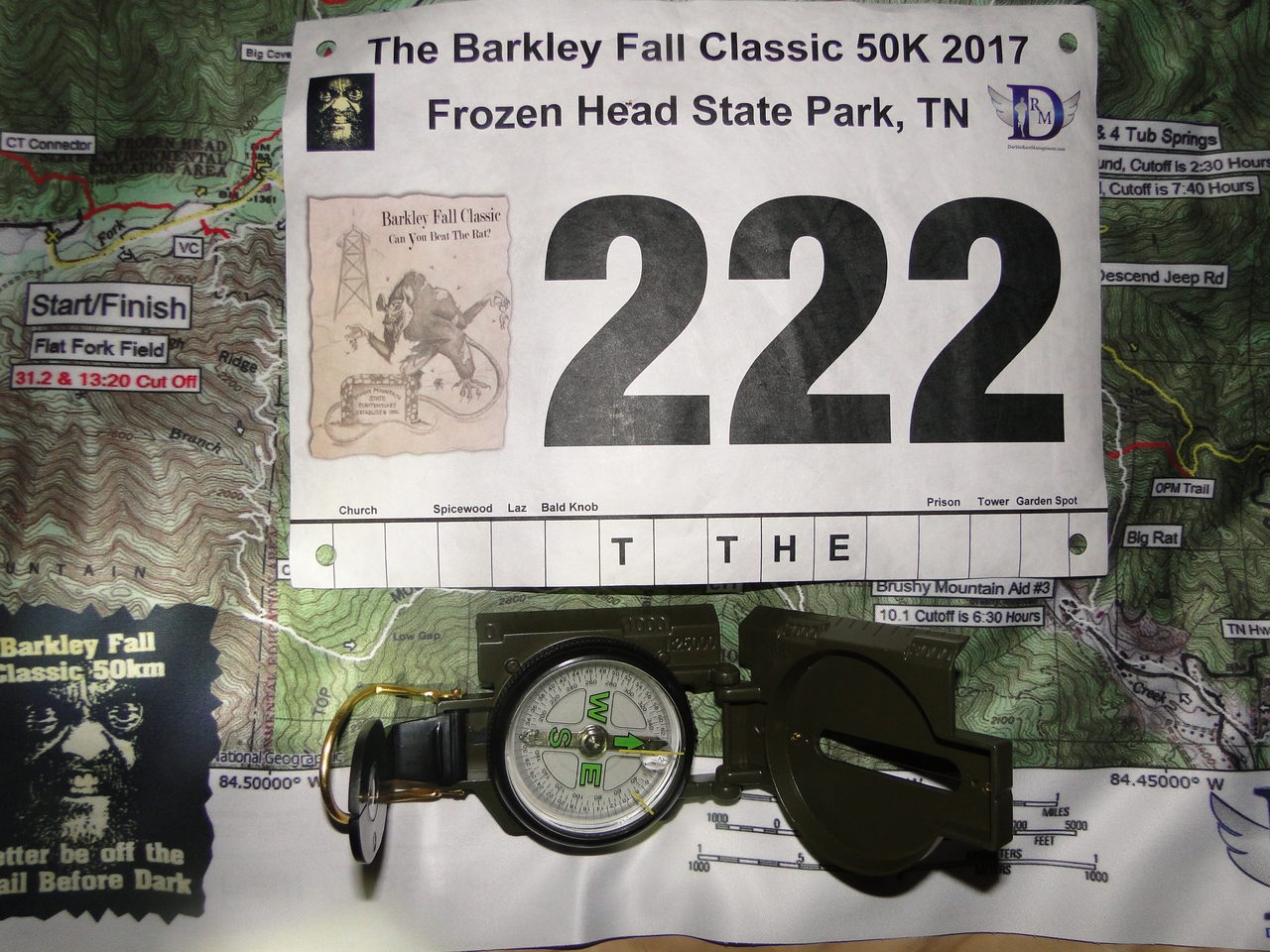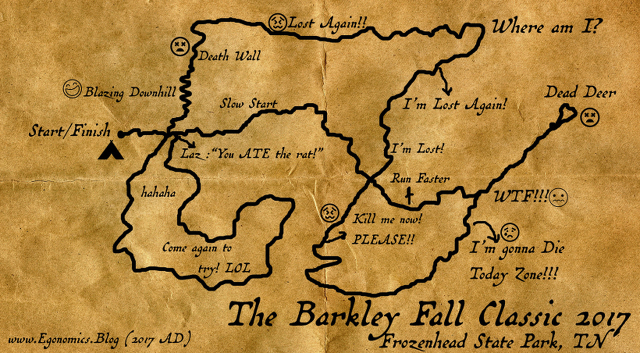 The Barkley Fall Classic is an annual 50 km footrace in Frozen Head State Park, Tennessee. It's on the same trail as the infamous Barkley Marathons, known as the World's toughest. Perhaps the race directors Gary Cantrell (Lazarus Lake or Laz) and Steve Durbin brainstormed this event to give people a taste of what being "out there" feels like as racers are on their own with no technology, navigating out of the Tennessee jungle alive in under 13.20 hours.