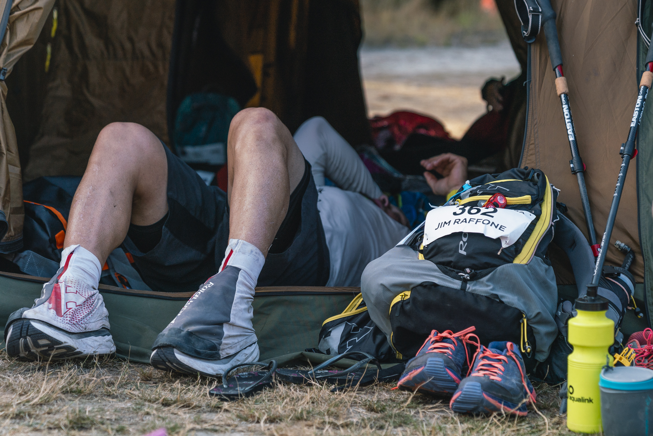 After running through the night and making one last epic push over a nearby mountain, darkness eventually turned into dawn. Michael Sandri stayed awake through the entire night to ensure he could greet every last participant coming in from the long stage. Sandri greeted Jim with a hug as Jim finally came into camp from his 27 hour day.