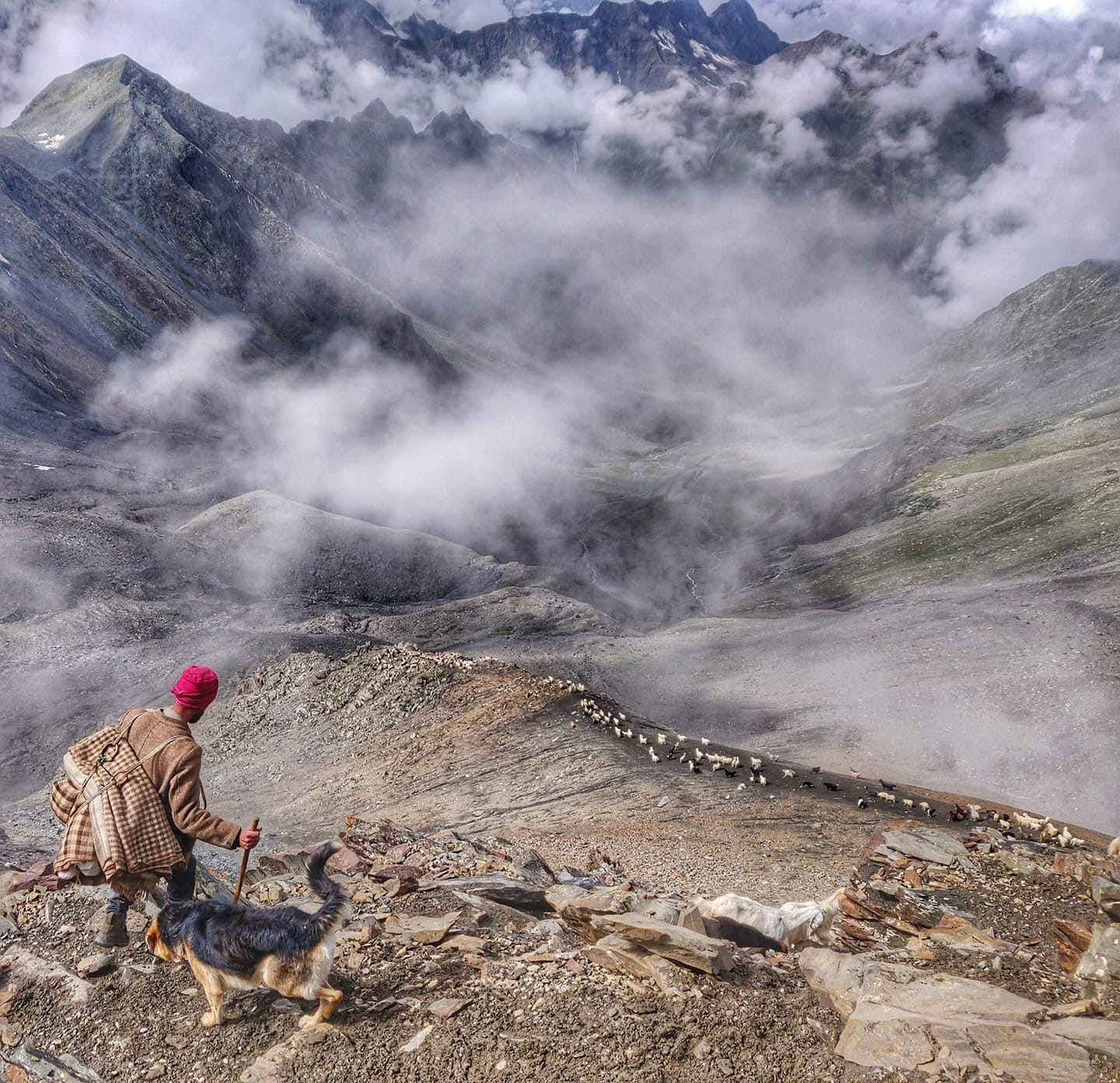 Descending from the Kugti pass (5,040 m) with a shepherd guiding his 500 sheep into the beautiful cloud indulged Chamba valley below. Kugti is one of the several passes across the Pir Panjal range used by shepherds for their annual migration to graze the high altitude meadows. Here we are crossing over from Rapay village along the Chenab river in Lahaul to the picturesque Kugti village in Bharmour, Chamba. The Kugti pass requires traversing of moraines and landslide-prone slopes on either side of the pass.