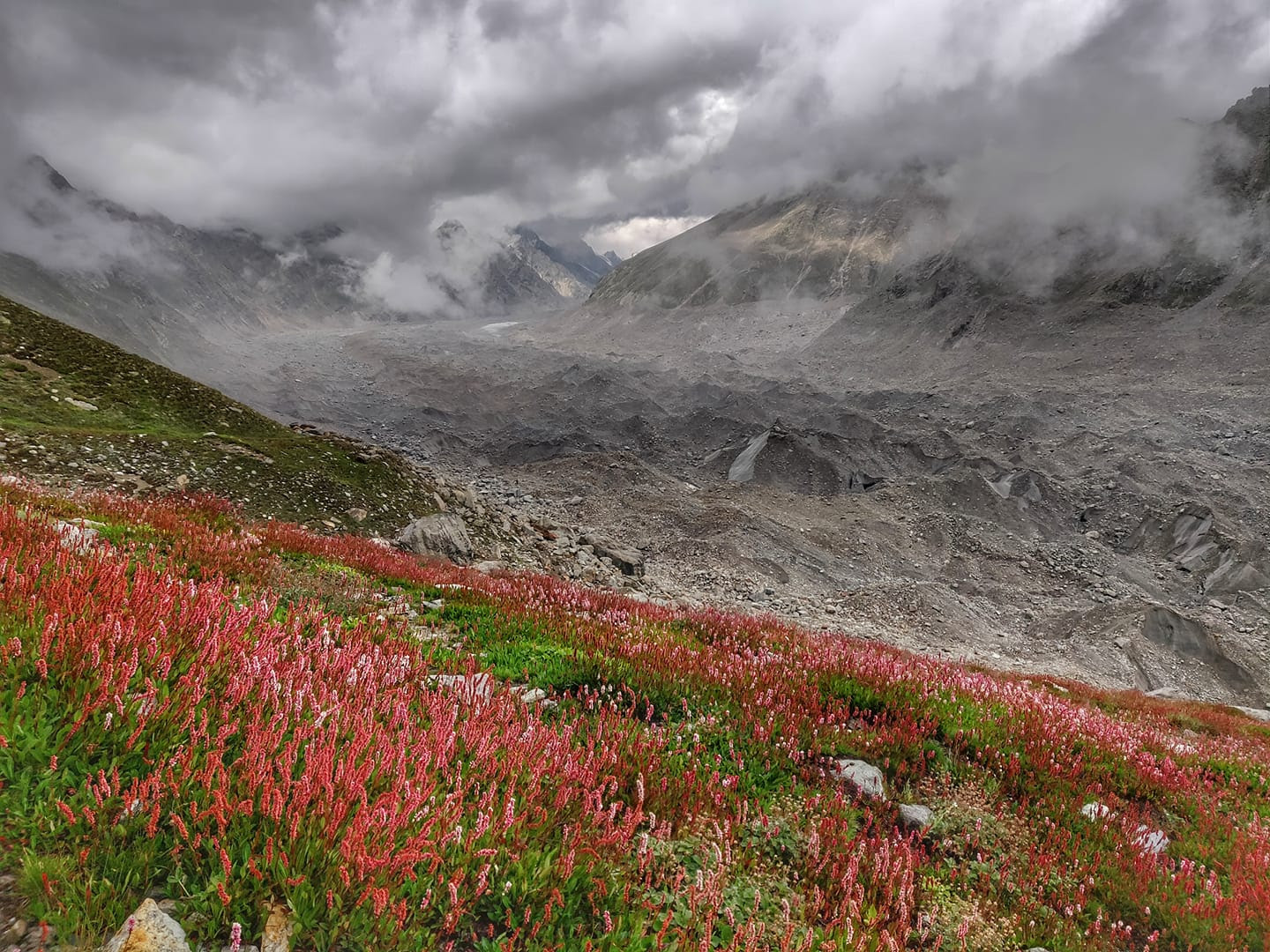 Bright red alpine flowers in the high altitude meadows (4200m) of the Miyar valley while descending the Pratap Jot (5,100 m) pass onto the moraines of the Kang La glacier. Pratap Jot is one of the several passes across the Pir Panjal range separating the Miyar and Saichu valleys. Around 10 shepherds and their 3000+ sheep graze the beautiful meadows of Saichu valley every year crossing one of these passes. The 25km long Kang La glacier seen here connects Lahual/Pangi with Zanskar, Ladakh – walking across this vast moraines landscape of huge boulders and rocks on top of melting ice is quite challenging.