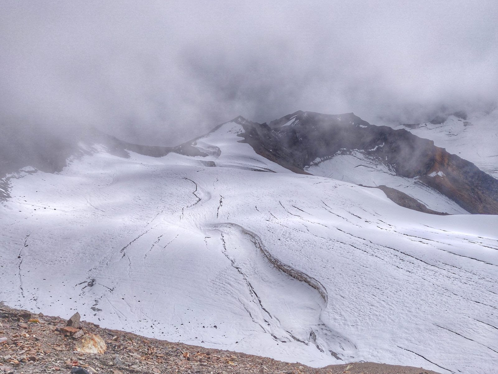 A heavily crevassed glacier as seen from the top of the Chobia pass (4,966 m), shepherd gateway across the Pir Panjal range separating the valleys of Lahaul/Pangi and Chamba. As per shepherds, the Chobia pass is the second most treacherous pass (after Kalicho) to cross the Pir Panjal range leaving around 20 out of 500 sheep dead during the annual crossing of this pass. From the Pangi side at Arat village along the Chenab river, one has to traverse steep landslide-prone valley slopes, a vast section of moraines and negotiate deep crevasses in the glacier (following a trail of sheep poop) before ascending a final steep rock to reach the narrow pass. On the Chamba side on the way to Seri Kao village, all bridges were washed away during flash floods in August 2018 requiring scaling steep trail-less slopes on one side of the valley unable to cross the forceful stream currents.