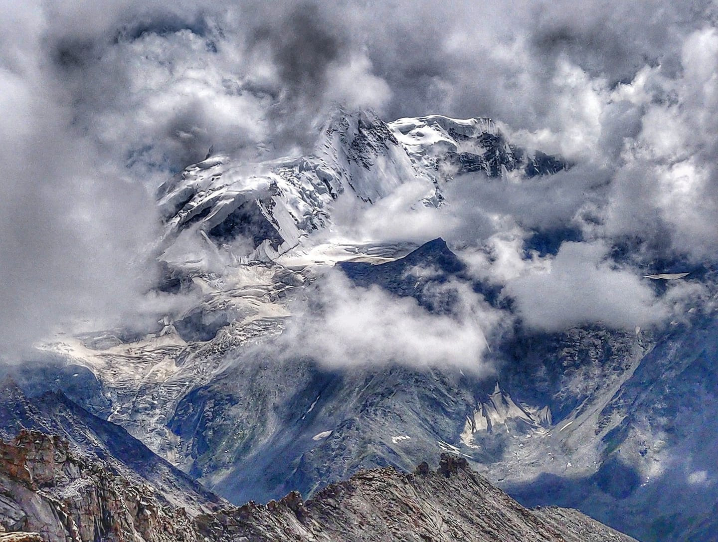 Menthosa peak, at 6,443 m, the second highest peak in Lahaul and Spiti, as seen from an unknown pass (5,300 m) while crossing over the Pir Panjal range from Saichu to Miyar valley in Pangi. Menthosa is situated in the Urgos Nallah, a tributary of the exceptionally beautiful Miyar Nallah. Here climbing up steeply from the beautiful alpine meadows of the Saichu Nallah beyond the last settlement of Tuan across vast stretches of moraines towards Great Himalayan Range to enter Miyar valley.