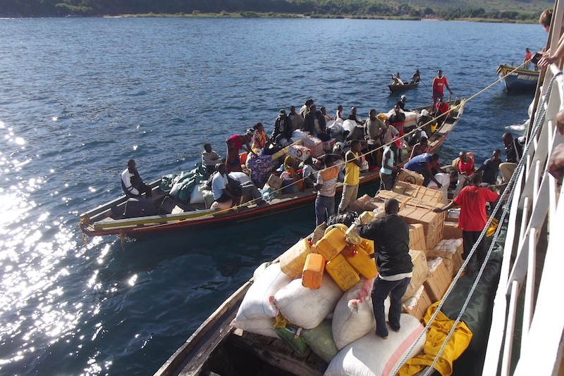 We had left Mpulungu basically empty, doubtless because no one in Zambia, aside from us, knew the Liemba was coming and no one had time to prepare any cargo or get ready to travel themselves. With each stop along the way passengers boarded and the empty hold gradually filled up with bags of grain and an endless variety of other cargo, the ships crane working overtime. Having started in Zambia with a few boxes of apples and oranges and apparently very little else in the way of cargo, by day two the deck was full of chickens and ducks, clucking and quacking, numerous motorbikes and bicycles and an extensive and aromatic collection of dried fish heading to market. We woke one morning to discover two large containers full of live tropical fish had somehow been hoisted aboard and were now ensconced like giant aquariums, complete with filters, on the foredeck.
