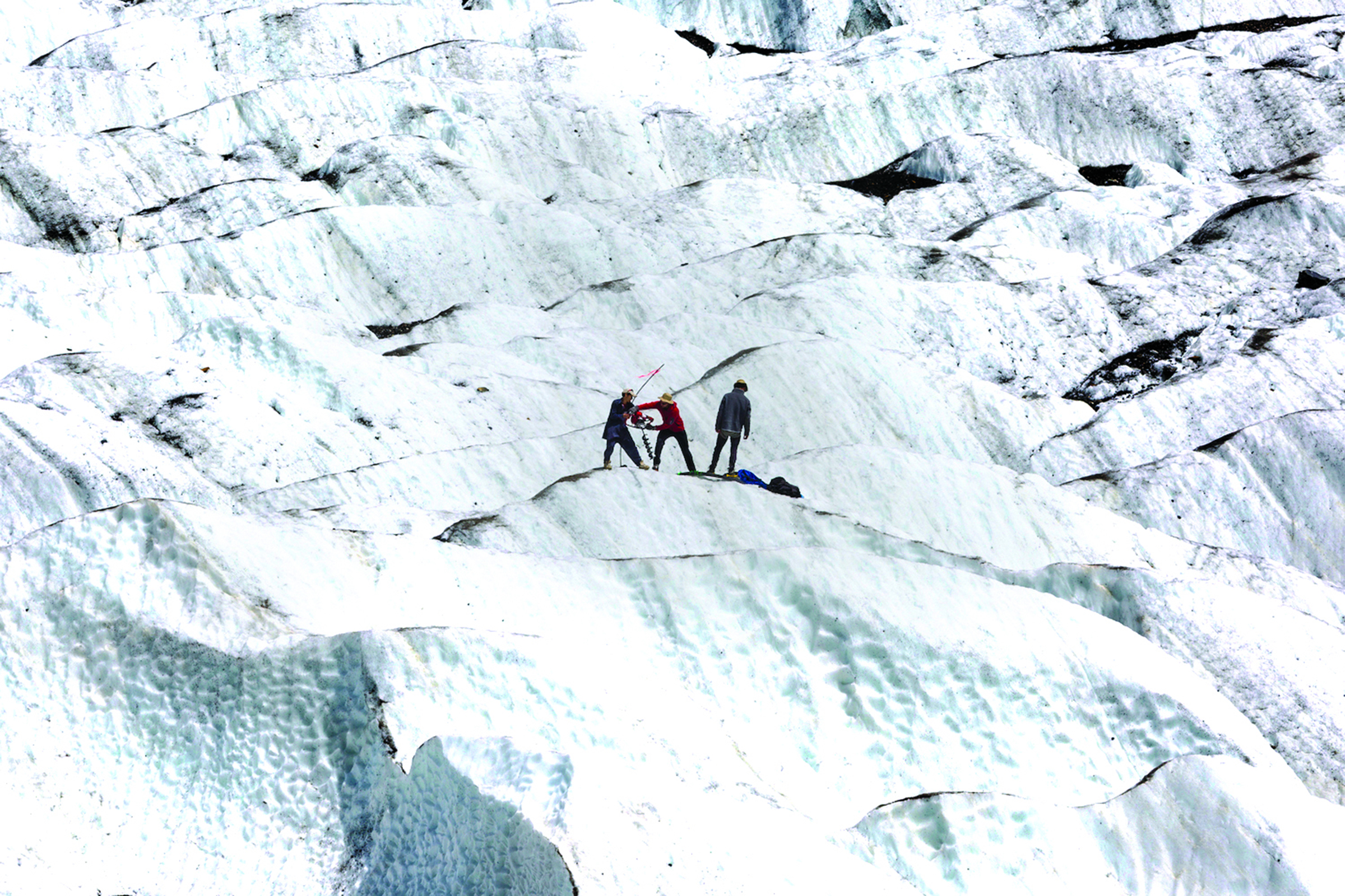 We spent the coming month completing the scientific objectives of the Project. We spent many days moving painstakingly across the behemoth glaciers we were studying. Towards their snouts the glaciers were covered with grey debris, which blended with brown hillsides to give the overwhelming impression of dreariness. The sun seemed to beat down with extra strength on the glacier, and the dusty air clogged our throats.