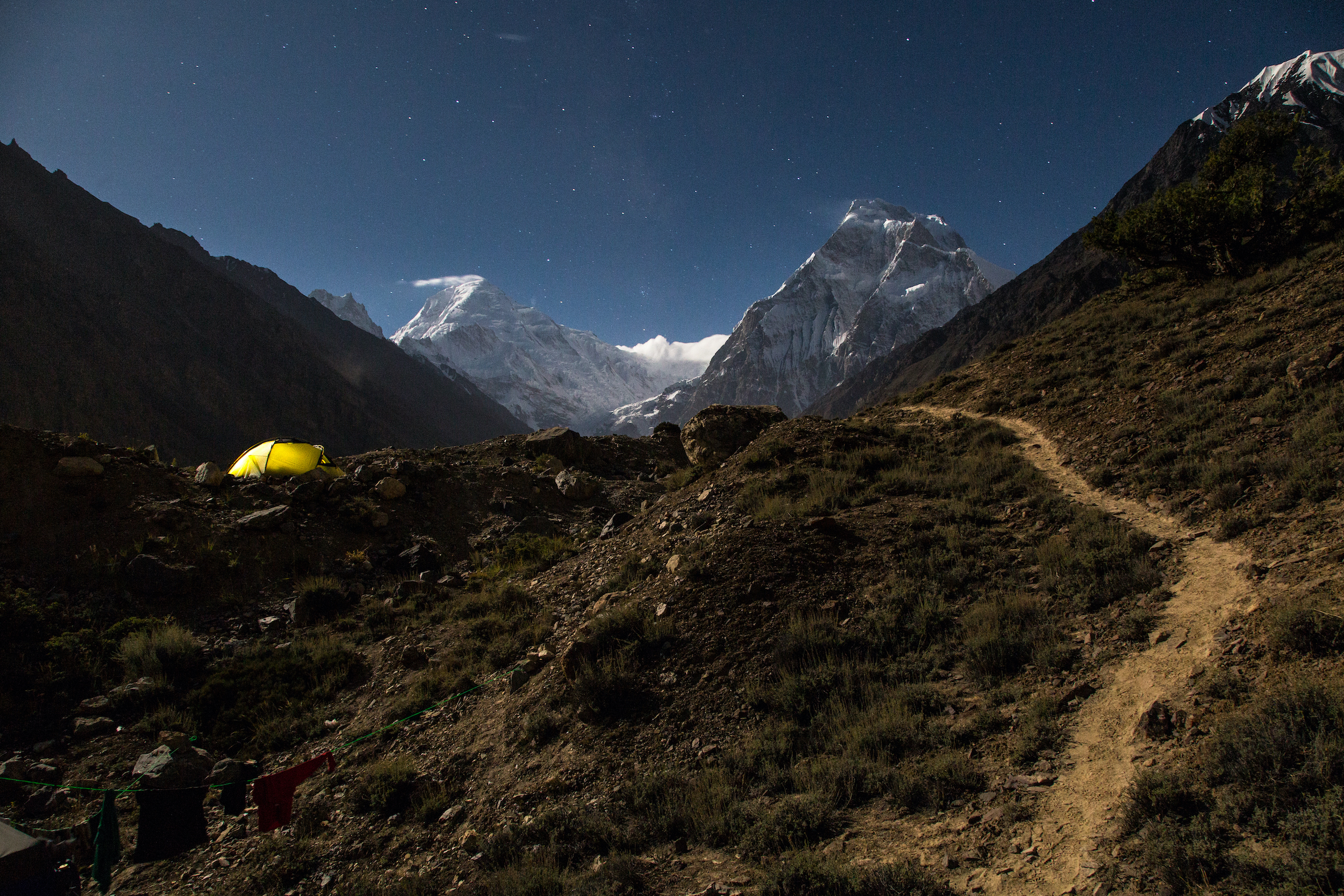 Reaching the far end of this part of the valley, where the mighty Khurdopin-Yukshin Gardan glacial system comes down to meet the Shimshal River, we met a few porters who had remained ahead of us. They were sitting down, and looked as if they had no intention of continuing. Our mountain guide Ali told us that the porters wanted to stay here for the night and continue the next morning. We spent the night under a million stars.