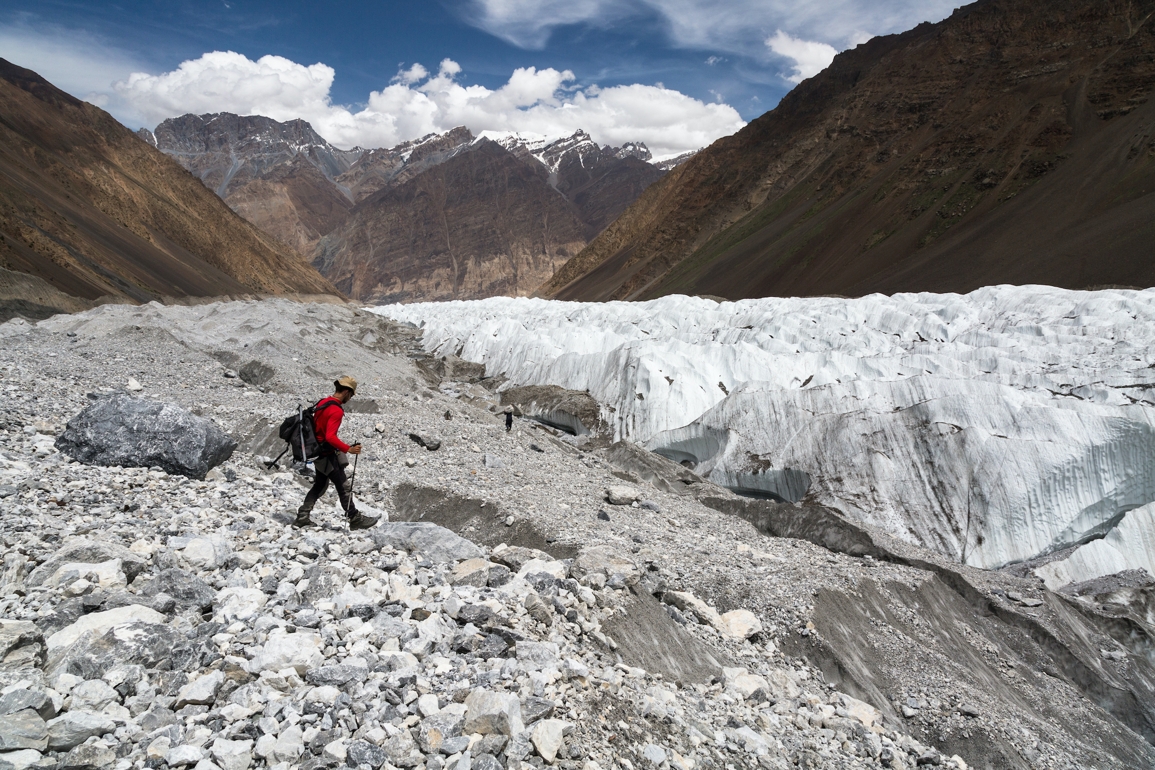 The final leg of our journey to base camp required hiking over the snout of Khurdopin glacier and then up the western edge of Yukshin Gardan glacier. It was hard going. The boulders that cover Khurdopin gave way as we walked over them.