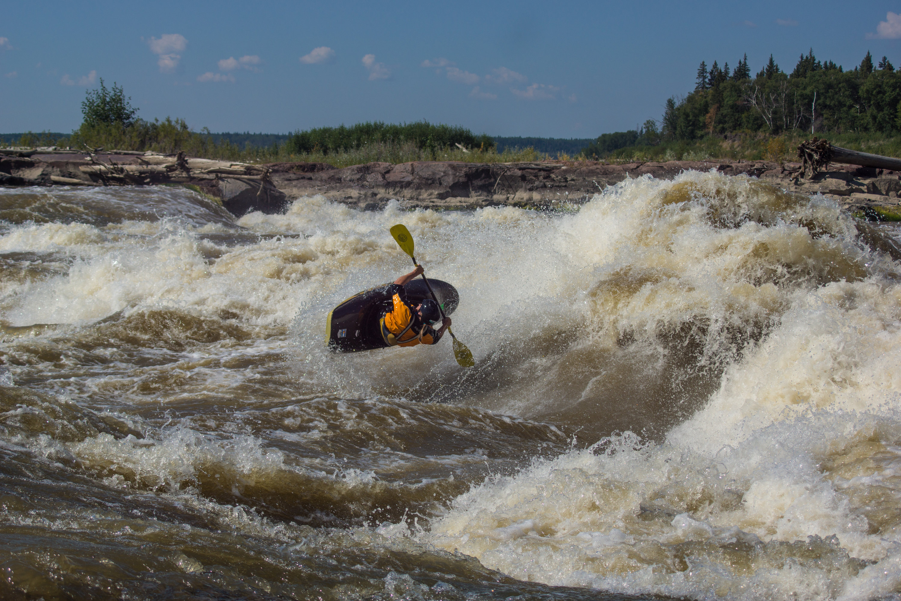 The river is three kilometers wide, hosting four different sets of rapids. Due to the massive width of the river, each set of rapids has multiple (more than 5) different channels. Each channel within a set of rapids is the length of a full-day river run. This means, (if I did my math correct), there are at least twenty different river runs to explore on the Slave River. All within ten minutes driving distance of each other. And this number doesn’t even include the smaller side channels, or runs where you combine multiple different channels in one run! This allows any paddler, no matter their skill level, numerous options to choose from. There are grade 1 floats, perfect for canoeists. There are grade 2 options, perfect for beginner kayakers. There are grade 3 rapids with world-class surf waves. And there are grade 4 and 5 rapids that have the potential to intimidate even the world’s most elite kayakers. In addition to the amazing river running, the Slave River offers epic surf waves for anyone from beginner to elite freestyle kayakers.