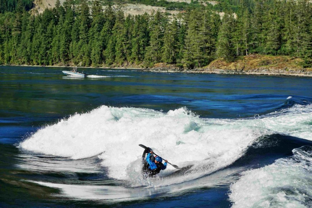 Skookumchuck is different. It is unlike any other kayaking destination. Skookumchuck is located on the Sunshine Coast of British Columbia, in the Sechelt Inlet. Yes, Inlet… not river. Skookumchuck is a tidal rapid, formed by the tides as ocean water moves in and out of the Inlet over a rock shelf. The salty water flows over the rock shelf and forms a picture-perfect, glassy, green surf wave. If there was a contest for smoothest kayaking wave in the world, Skook would win.