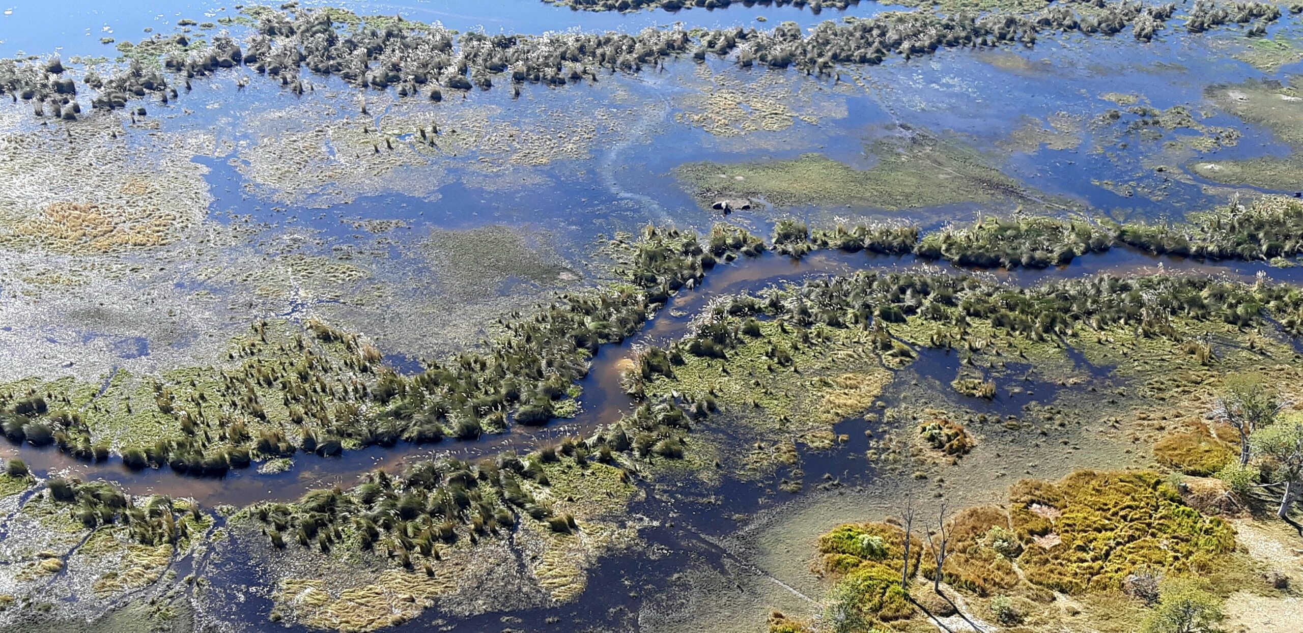 The grand finale to our time in northern Botswana is an ‘open doors’ helicopter ride over some of the most remote and untouched areas of the Okavango Delta. Taking off from the camp’s private helipad we fly across the Khwai River and over Moremi Game Reserve. Flying at the same height as a couple of Bateleur Eagles, we get a new perspective on these magnificent birds and a ‘bird’s eye’ view of everything below. Elephants, giraffes, waterbuck, red lechwe and herds of buffalo, all look so small from above. The water is so clear we can see hippo trails on the bottoms of the channels and waterholes. Ducking underwater as soon as they hear our approach, the hippos think they are now invisible, but we can see them clearly as they walk along the sandy bottom.