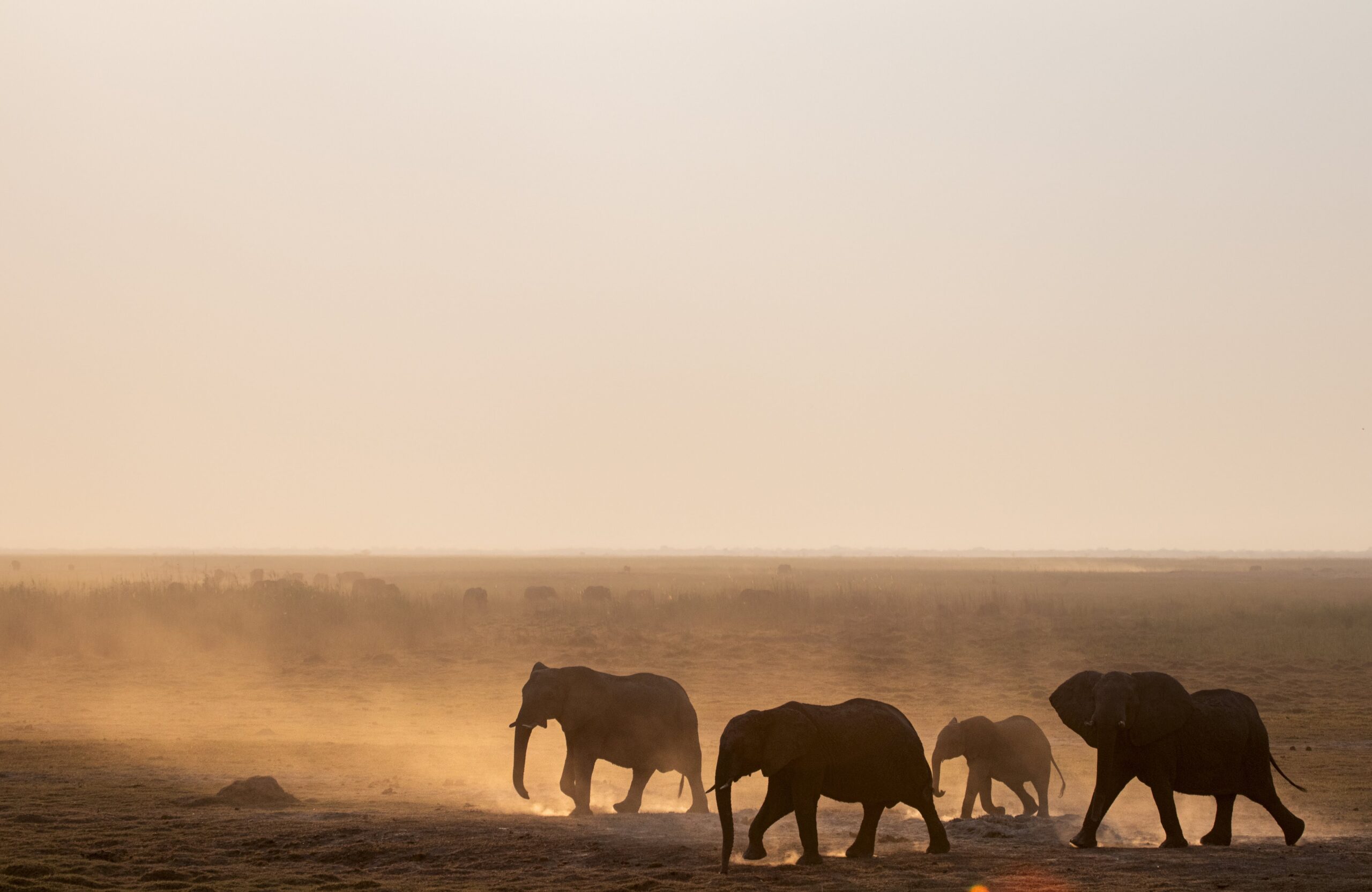 Later that day the sunset is magical. The channels of water on the floodplains light up like molten lava, as the sun sinks in the sky. Thousands of Burchell’s starlings fly overhead, leaving the mainland to roost in the safety of the reeds on the floodplains. A scops owl trills in a nearby tree and we sit and listen. As it gets dark we find ourselves surrounded on all sides by elephants, moving remarkably silently given their size and the dense, dry vegetation.