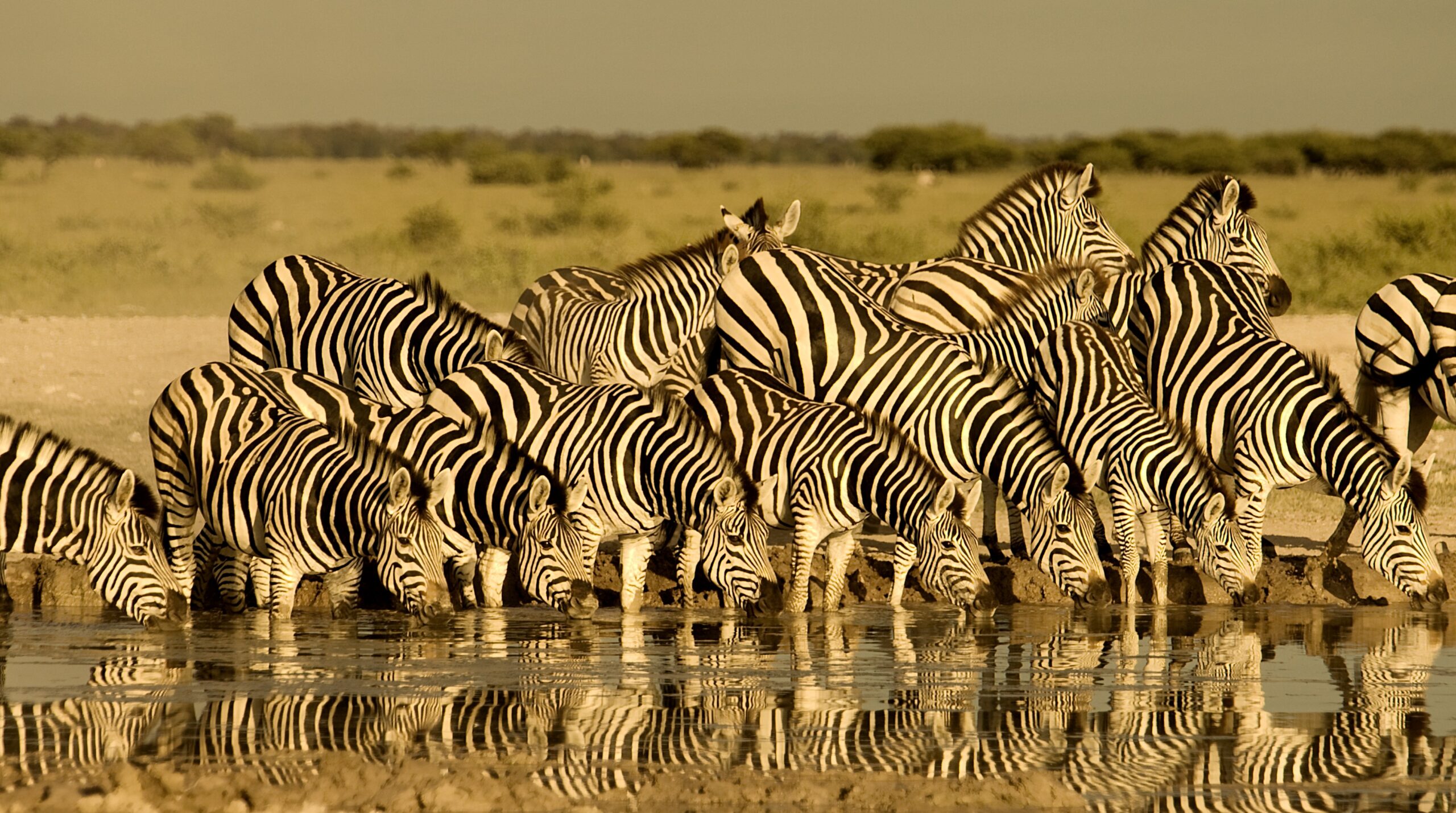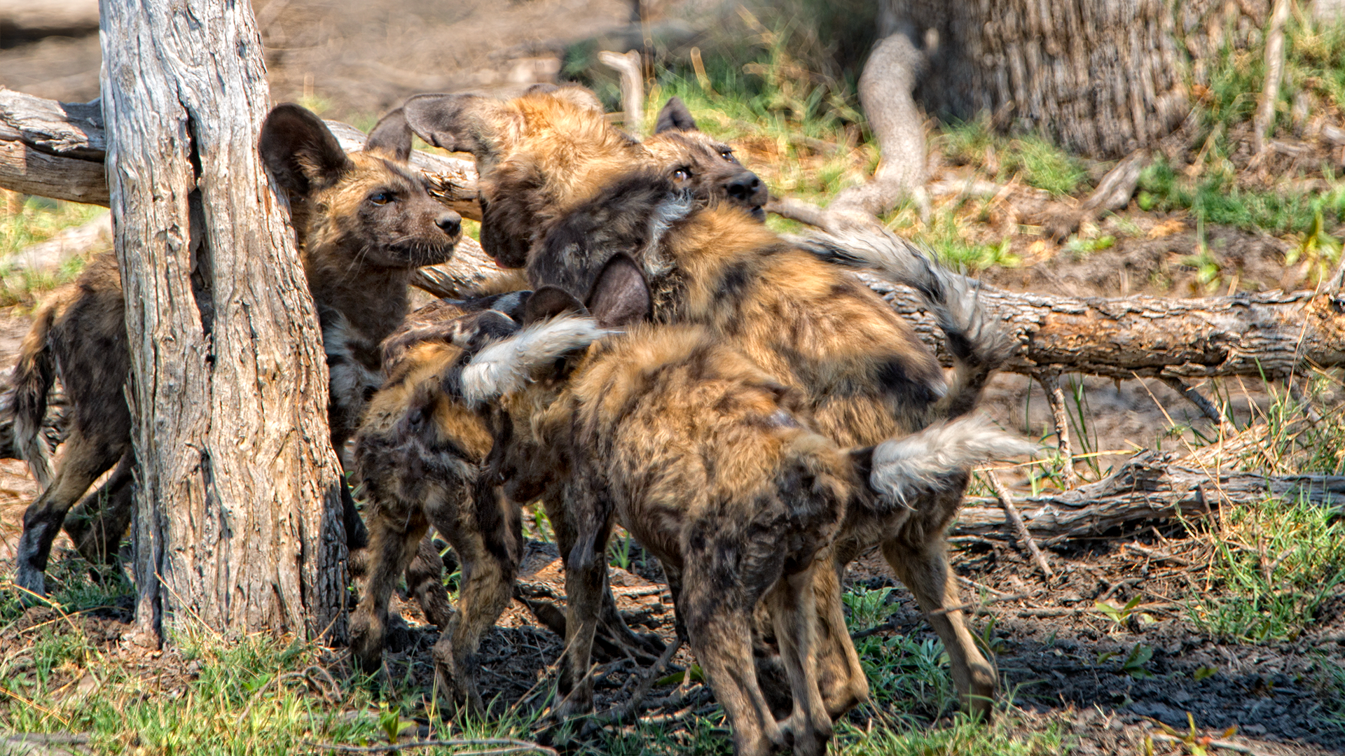 Heading in the direction the wild dog has come from, we come to a wild dog den. It is quiet when we arrive. But within minutes a female arrives, calling out with a high-pitched chirrupy voice. Five babies emerge from the den and run towards her in great excitement. She regurgitates some food and they gobble it down, then latch on to her teats and begin to suckle. We watch while she patiently waits until they’ve had their fill, before she runs around the perimeter of the den’s territory, sniffing and marking her scent, then lying down to rest in the sand. With an adult present, the four-month-old babies clearly feel a little more confident, and we are treated to a wrestling match and some games before they eventually tire and disappear back into the den. It is getting dark by now and time to head back for dinner. Seventeen giraffes of various ages and sizes amble along the dusty road beside us, almost as if they are an entourage escorting us home.