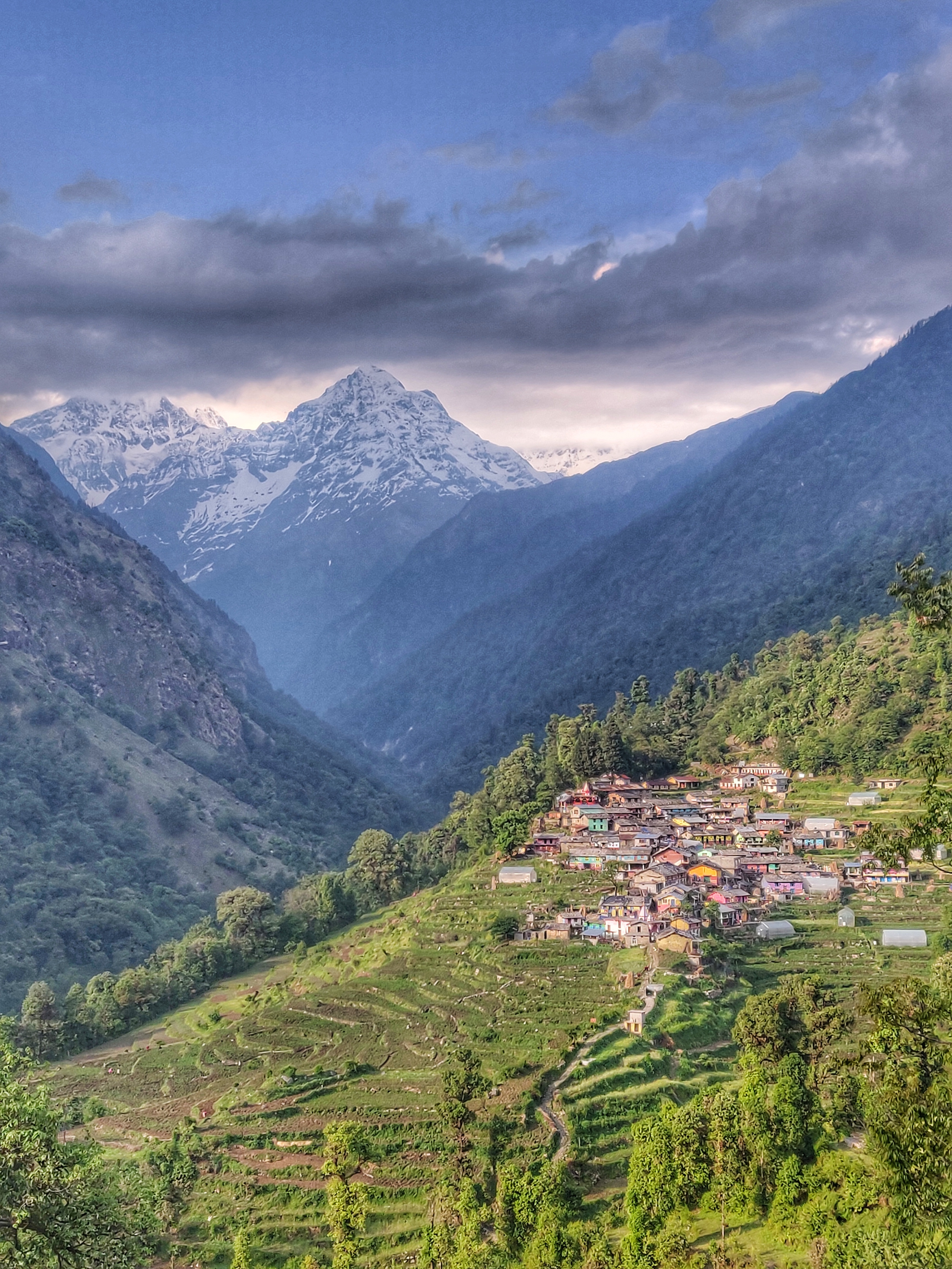 Towards Western Uttarakhand near to the neighbouring state of Himachal Pradesh we came across remote fairytale villages built from beautiful natural stone and wood. We discovered ancient wooden temples beautifully handcrafted by previous generations. Homes have several vertical levels with beautifully crafted terraces, animals staying below and people on top.