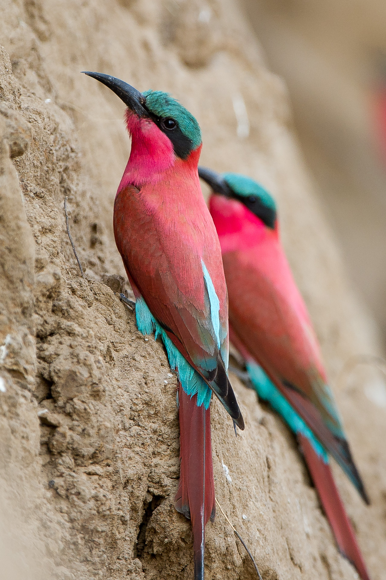 We stopped on the Luangwa River banks to watch the Southern carmine bee-eaters, who were just starting to arrive at their breeding grounds. Later in the season the river would become a blur of red and blue, as thousands of these bee-eaters selected their breeding sites along the steep river banks. We knelt of the top of the bank, peering over the edge, to observe them digging breeding tunnels into the carefully chosen bank. The soil needs to be sandy enough to dig into but sturdy enough not to collapse, especially when you realise these burrows can be over three metres deep. The carmine bee-eaters vivid pinkish-red plumage, turquoise crowns and streaming tails made these birds an absolute pleasure to watch.