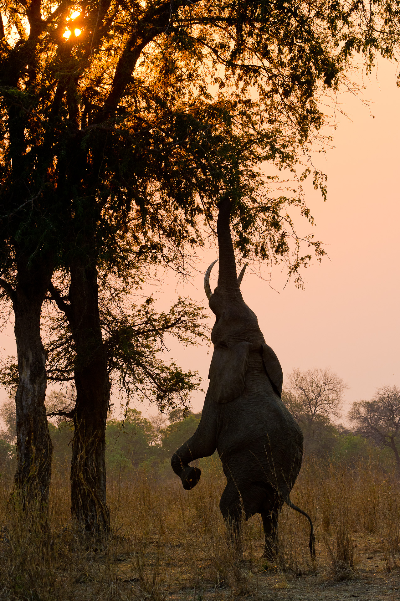 Out on an early morning game drive, we stopped for tea, perched high up on the river bank. Looking down, hippos and crocs crowded below us, a lone African skimmer swooped low over the water, a giraffe on the far bank made its way tentatively down to the river’s edge to drink, and elephants, like great, grey, ghosts glided across the landscape. The shrill and distant call of a fish eagle, accompanied by the background cooing of doves, completed the scene. We listened to the muted splashing as a family of elephants slowly crossed the river, wading through the shallow water, single file, with the matriarch up front, youngsters following her lead and another adult bringing up the rear. Reaching the other side they dried off with a quick dust bath and disappeared from sight. Our own tummies rumbling by then, we decided it was time to head back for breakfast, though our morning’s wildlife encounters were by no means over yet. Rounding a bend we came across a pair of mating lions, with the female definitely not backwards about coming forwards, and seeming rather demanding in the ‘bedroom department’. Around the next twist in the road an elephant stood on his hind legs, trying to reach some tasty seedpods that hung just out of reach of his extended trunk.