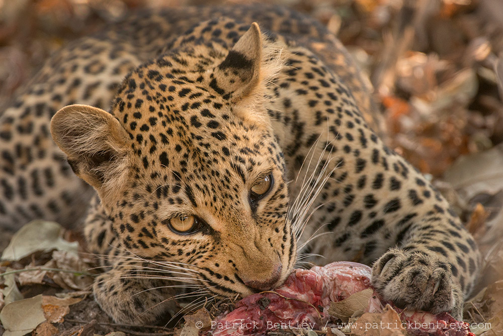 Passing by the ‘leopard tree’ of the previous day, we found the impala carcass, looking a little ‘worse for wear’ but still firmly wedged in the tree, and the leopard herself relaxing on the ground. A hungry hyena lay nearby, with his face resting on his paws, looking somewhat forlorn as he patiently waited, hoping the carcass would somehow dislodge and drop down into his waiting jaws… he was in for a long wait.