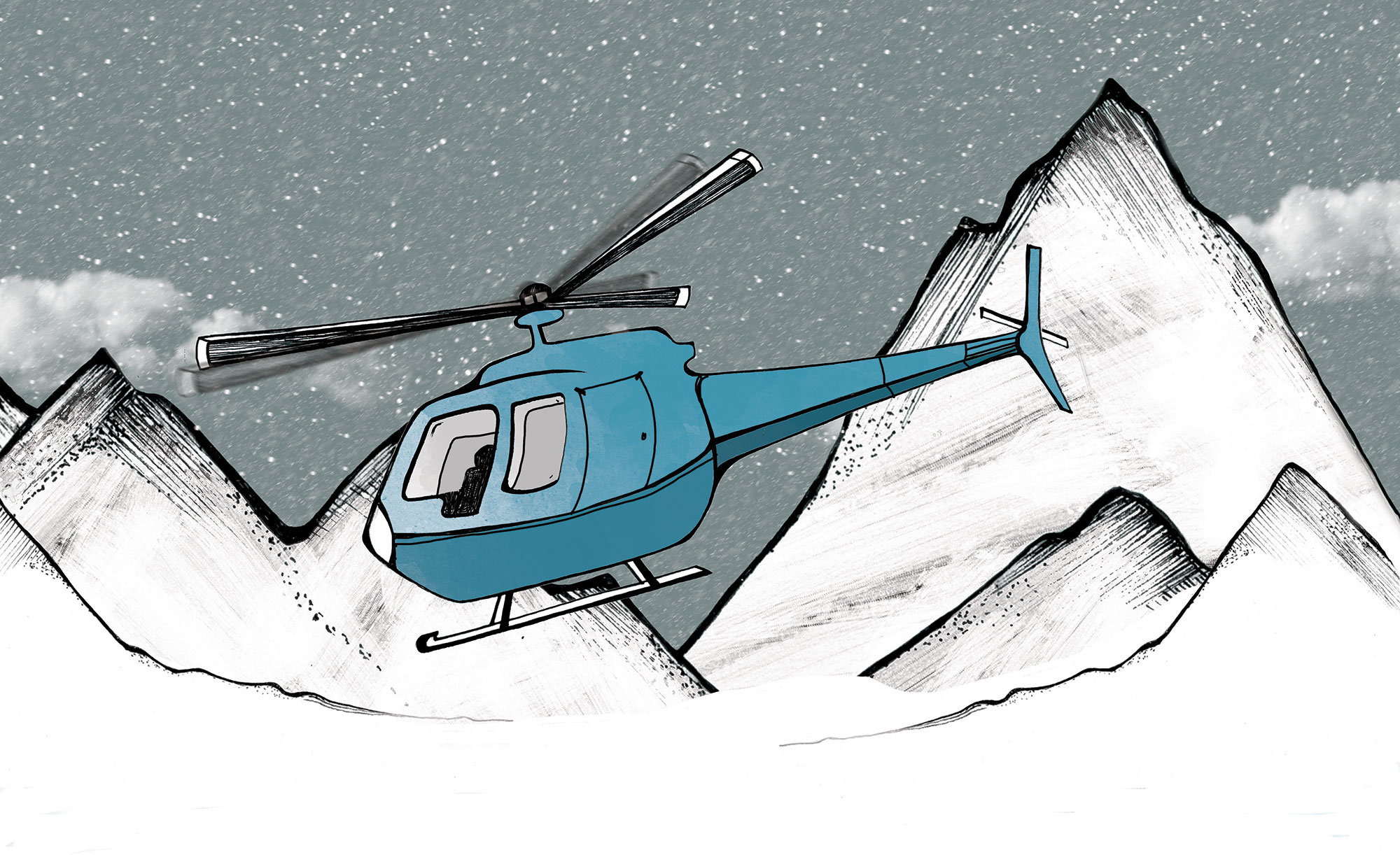 The noise of the two helicopters can be heard throughout the valley. One will be used to evacuate the victim and the other will come along for support. The pilots, the mechanical engineers, and I make a quick plan for the operation. The chief pilot officer fills us in on our short window of suitable meteorological conditions.